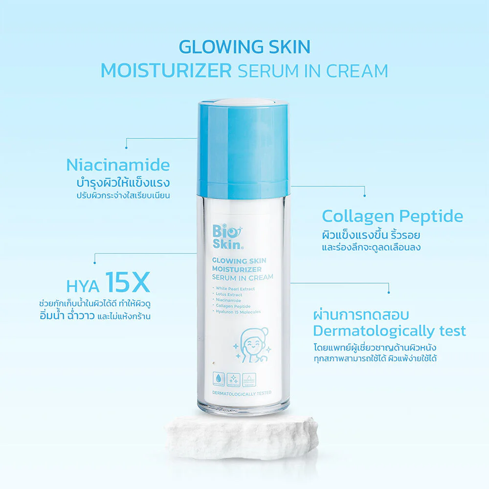 Bioskin Glowing Skin Moisturizer Serum In Cream 30g A facial moisturizer in a serum-in-cream texture, packed with valuable extracts such as White Pearl, Vitamin C, Niacinamide, and Collagen Peptide, revitalizes neglected skin, leaving it smooth, radiant, and reducing wrinkles  and also helps retain water and keep skin hydrated and glowing.