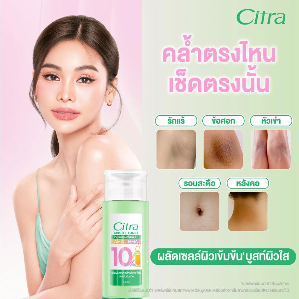 Citra Bright Toner 140ml Body toner combines 10 concentrated AHA extracts and BHA to help exfoliate dull skin cells and dark spots, even out skin tone, and Vitamin B3 to boost skin to look brighter and restore the skin's protective barrier, revealing smooth, clear, plump, and radiant skin.