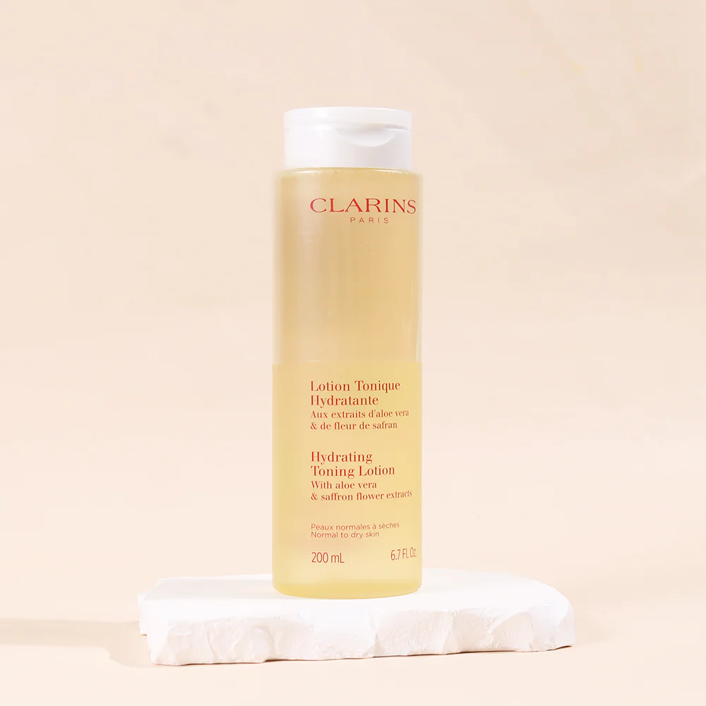 Clarins Hydrating Toning Lotion 200ml Skin conditioning lotion enriched with Aloe Vera and Saffron Flower extracts helps restore smoothness and moisture, while providing a refreshing feeling to the skin.