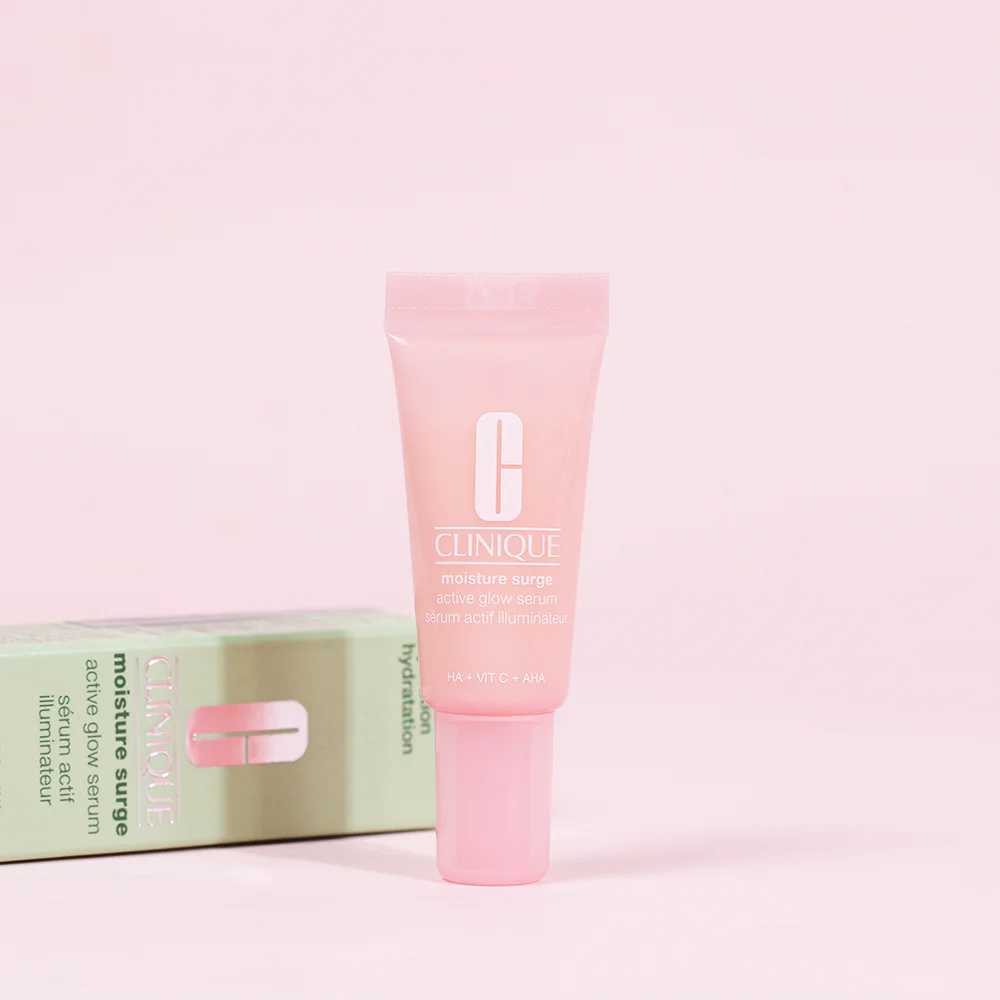 Clinique Moisture Surge Active Glow Serum 5ml A facial serum with a light, milky texture, combined with 5 types of lactic acid, hyaluronic acid, and vitamin C, gently exfoliates, adds moisture, reduces dark spots, and brightens the skin, leaving it smooth, plump, glowing, and radiant.