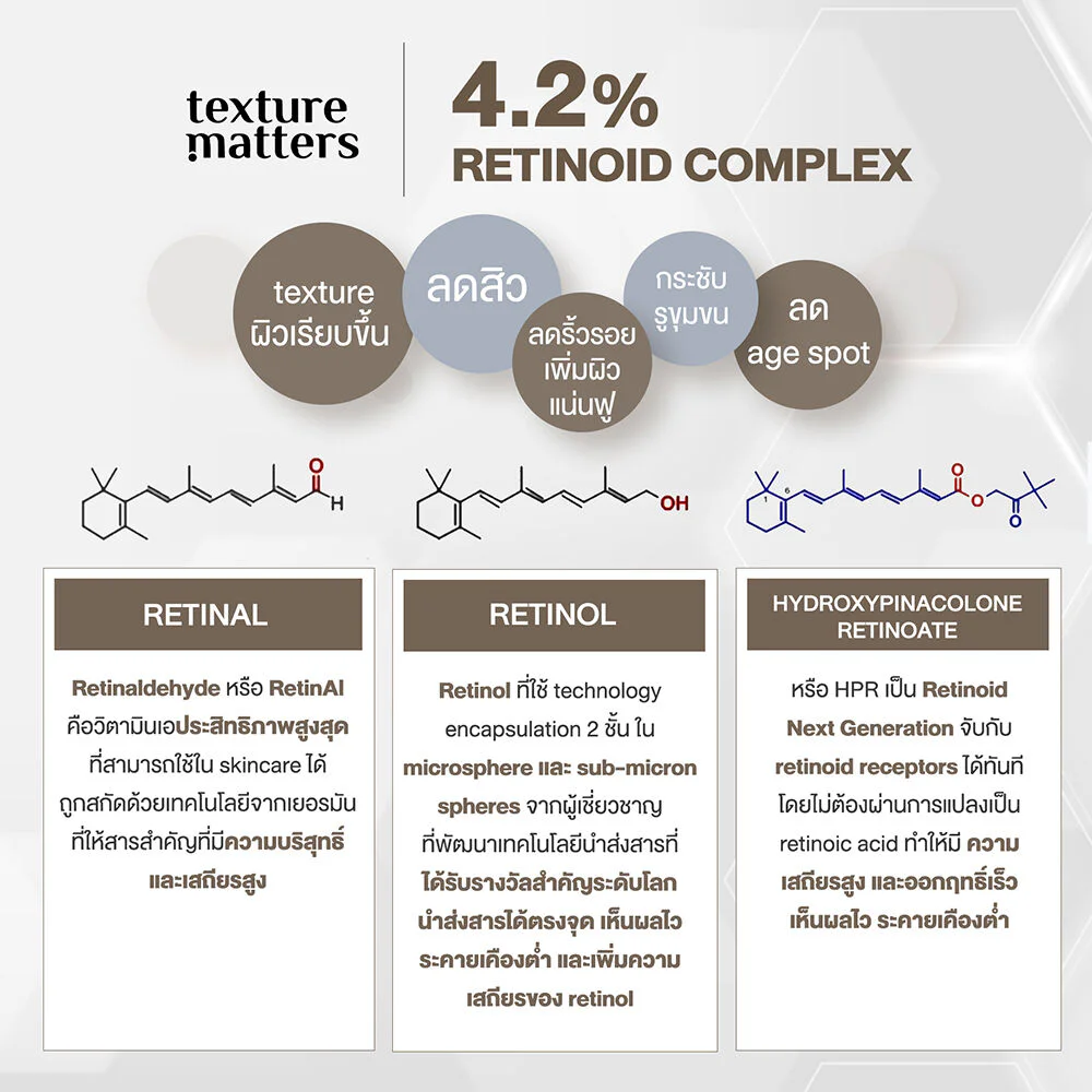 Texture Matters Melatonin In Retinal Intensive Night Resurfacing Serum To Oil 30ml This intensive serum is ready to level up your skin quality with a concentrated formula that combines 3 forms of high-performance vitamin A derivatives with encapsulation technology that protects the stability of vitamin A for long-lasting effectiveness. It consists of Retinaldehyde (RetinAl), RetinOl, and Hydroxypinacolone retinoate (HPR) that work together with Melatonin to restore skin quality, and Astaxanthin to help reduce the appearance of wrinkles, leaving skin smoother, plumper, and firmer. It also contains concentrated brightening ingredients to enhance skin's clarity and evenness, and many other important ingredients that help care for the skin's protective barrier, reduce irritation, and add moisture to the skin.