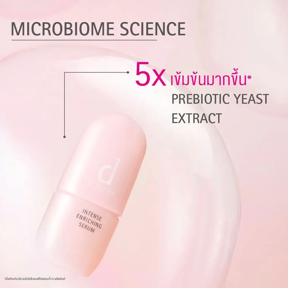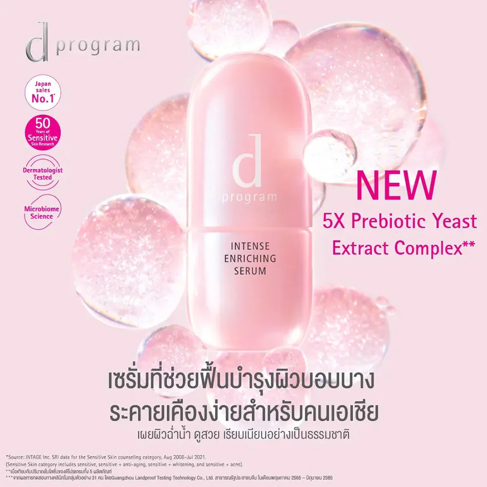 D Program Intense Enriching Serum 45ml This facial serum features a unique formula developed from over 50 years of research on sensitive skin. It includes a concentrated Probiotic Yeast Extract Complex to restore moisture and maintain skin balance, combined with Mangosteen Extract, Chestnut Extract, and DP Complex to retain moisture, reduce the appearance of wrinkles, and strengthen the skin's protective barrier. The result is smooth, hydrated, and healthy-looking skin.