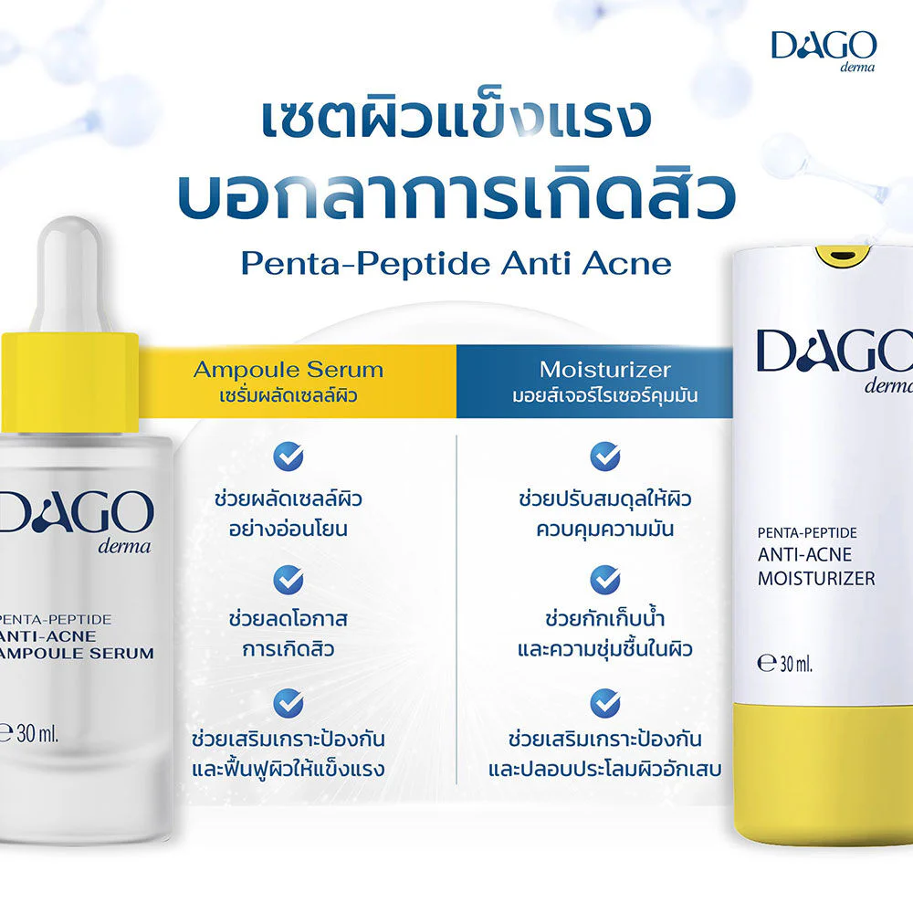 Dagoderma Penta Peptide Anti-Acne Ampoule Serum 30g Facial serum containing BHA, Zinc PCA and Pentasodium Tetracarboxymethyl Heptadecanoyl Dipeptide-12 helps care for acne-prone skin, controls oil on the face and exfoliates to make skin look brighter. It also combines natural extracts to soothe and moisturize the skin, revealing smooth, healthy skin.