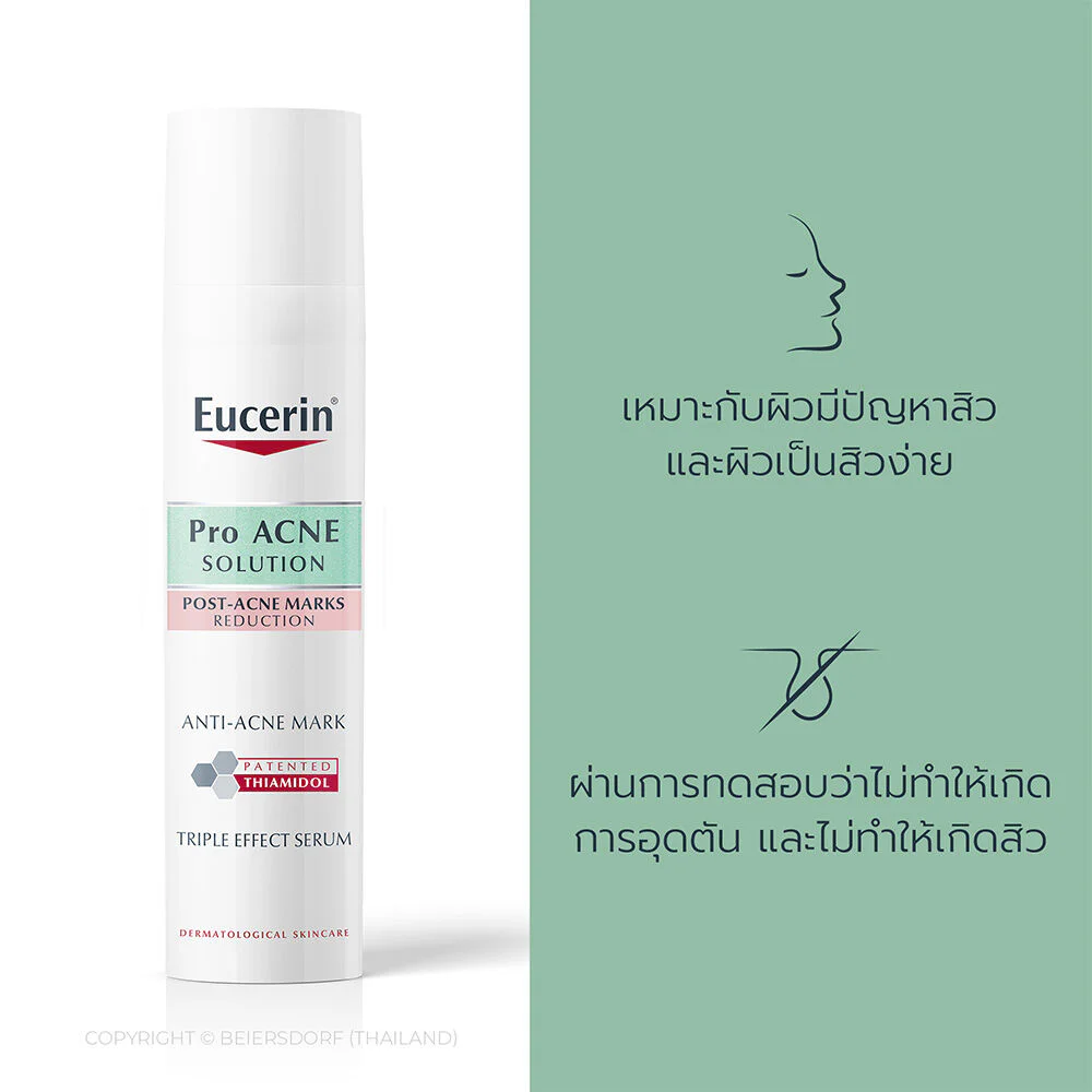 Eucerin Pro Acne Solution Triple Effect Serum 40mlFacial skincare product for those with acne scars, oily skin, and those prone to acne. The concentrated serum formula reduces dark acne scars, making the skin look brighter and helping control oiliness with a formula combining THIAMIDOL, a powerful patented substance, exclusive to Eucerin, helping reduce deep acne scars and reduce the chance of acne scars recurring. Salicylic Acid and natural extracts, Licochalcone, reduce clogged acne problems and reduce irritation. Comes with Sebum Regulating technology.