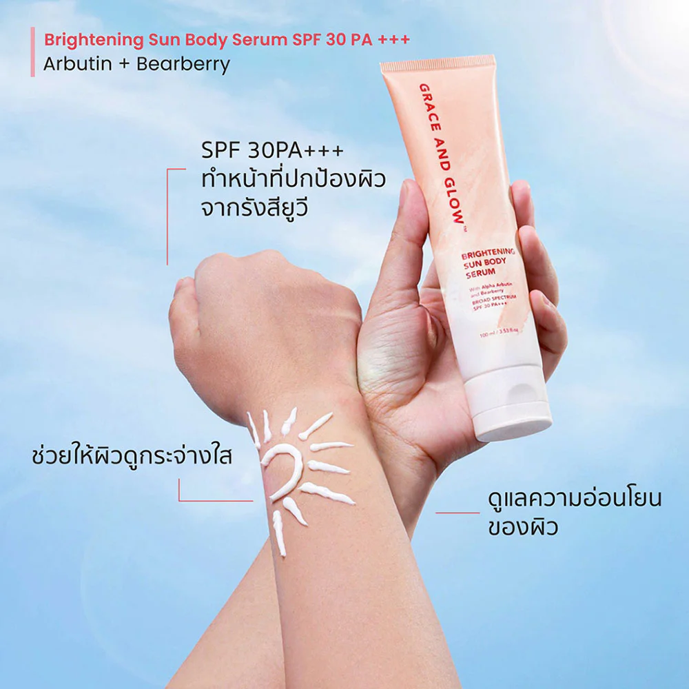 Grace And Glow Brightening Sun Body Serum 100ml Body sunscreen serum combines Arbutin and Bearberry to protect the skin from UV rays while maintaining moisture for smooth, radiant, and healthy skin.
