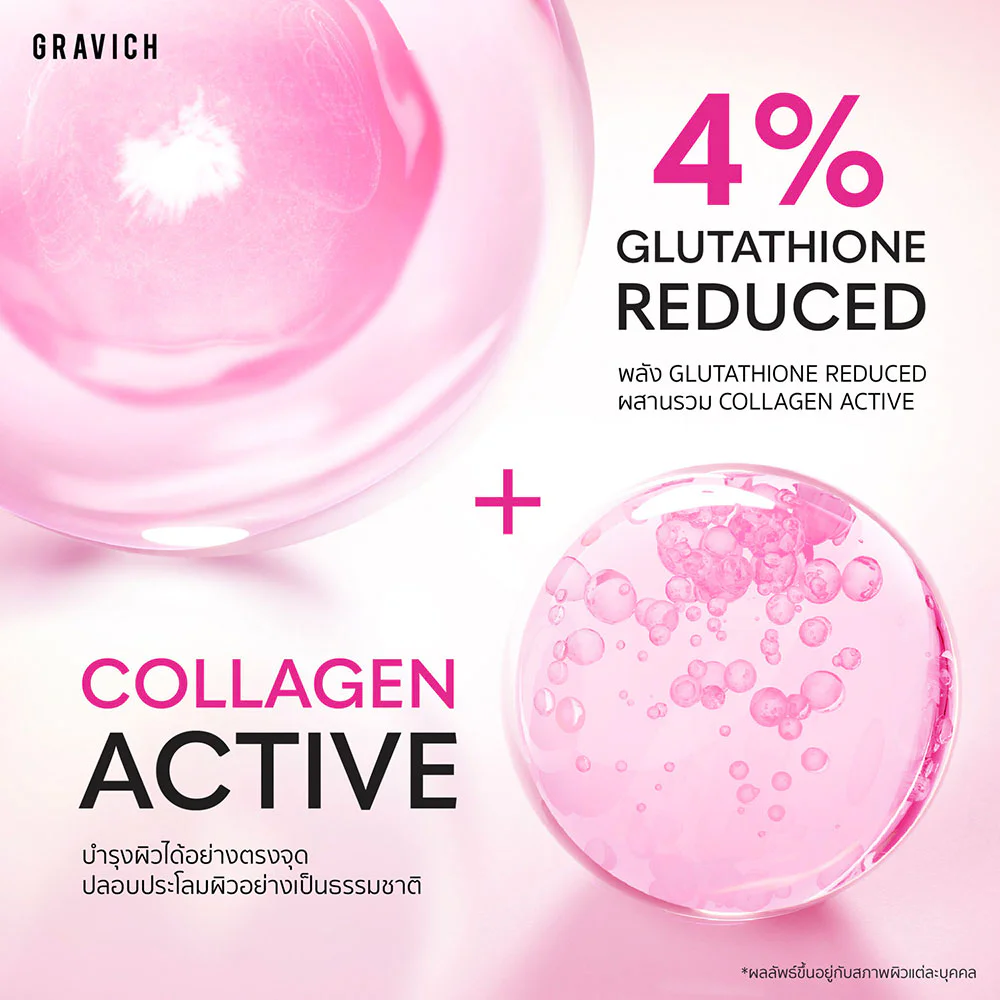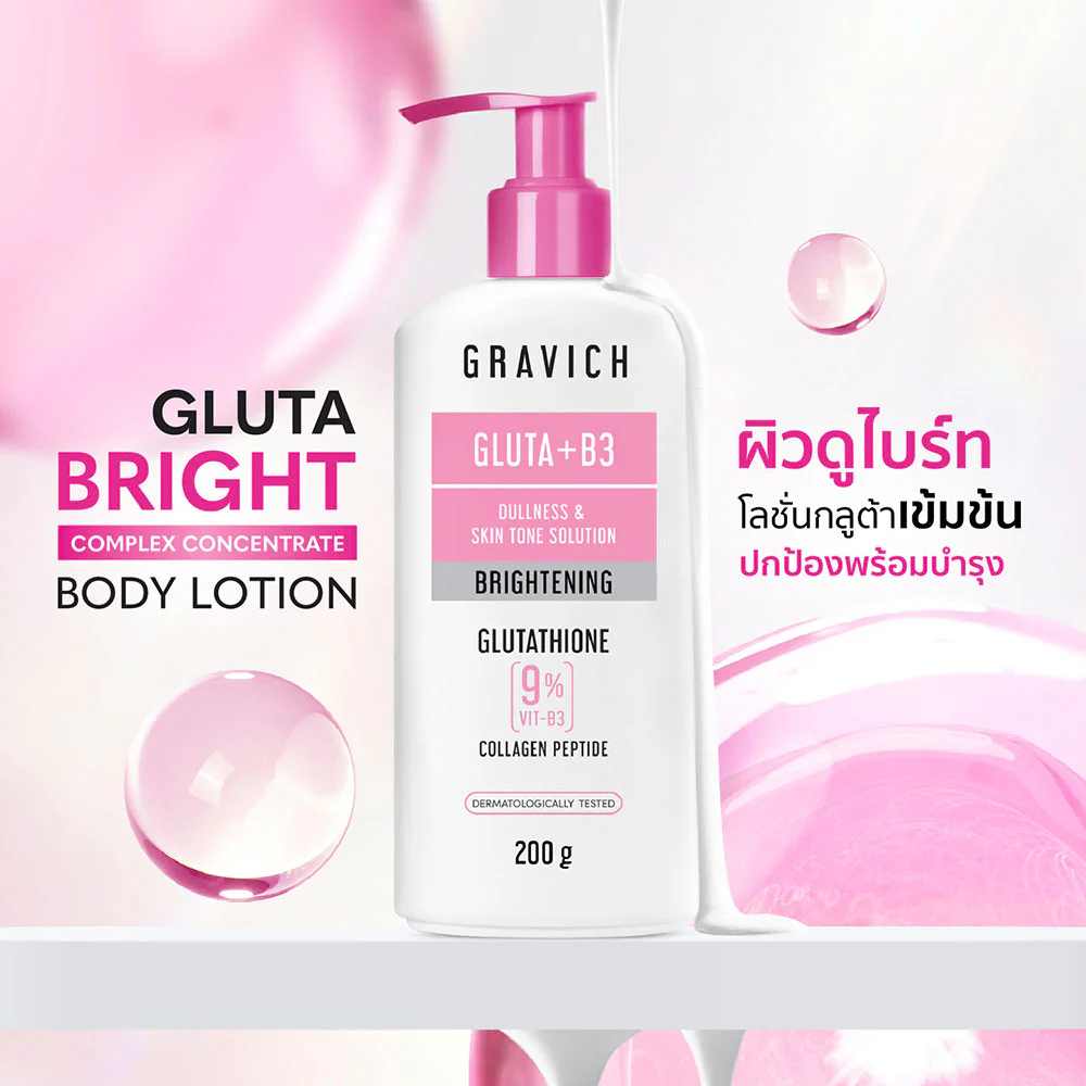 GRAVICH Gluta Bright Complex Concentrate Body Lotion 200g Gluta Bright body lotion, concentrated gel texture, light and comfortable on the skin, not sticky, combined with Glutathione, Collagen and Niacinamide, helps nourish the skin to be smooth and even, tighten pores, dark spots and dullness appear to fade, giving the skin soft and moist, looking bright and healthy.