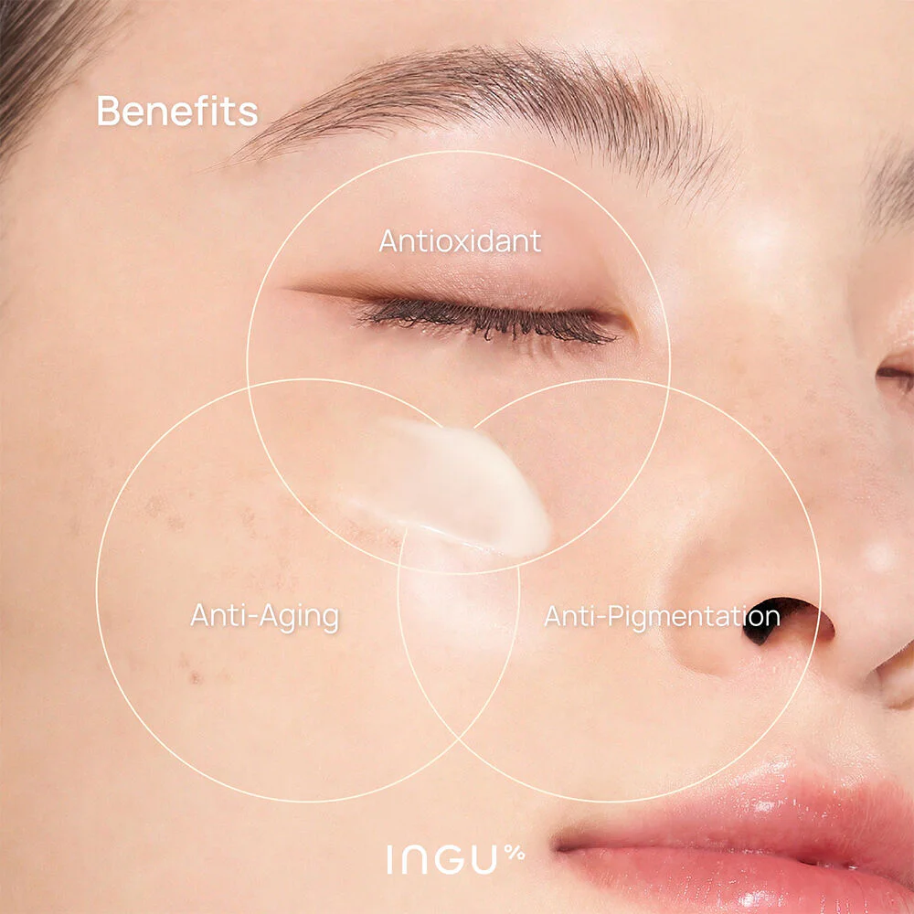 INGU Vitamin C AOX Glowing Serum 30ml A concentrated facial serum with a light texture that absorbs quickly and leaves skin feeling comfortable. Enriched with Thai basil extract, it soothes the skin and combines Vitamin C & E in an encapsulation form to help maintain its nourishing effectiveness throughout the day. Enhanced with Venuceane™ deep sea extract and Pollustop® innovation, it helps restore and protect skin damaged by UV rays, dust, smoke, and pollution, revealing smooth, radiant, healthy, and vibrant skin.