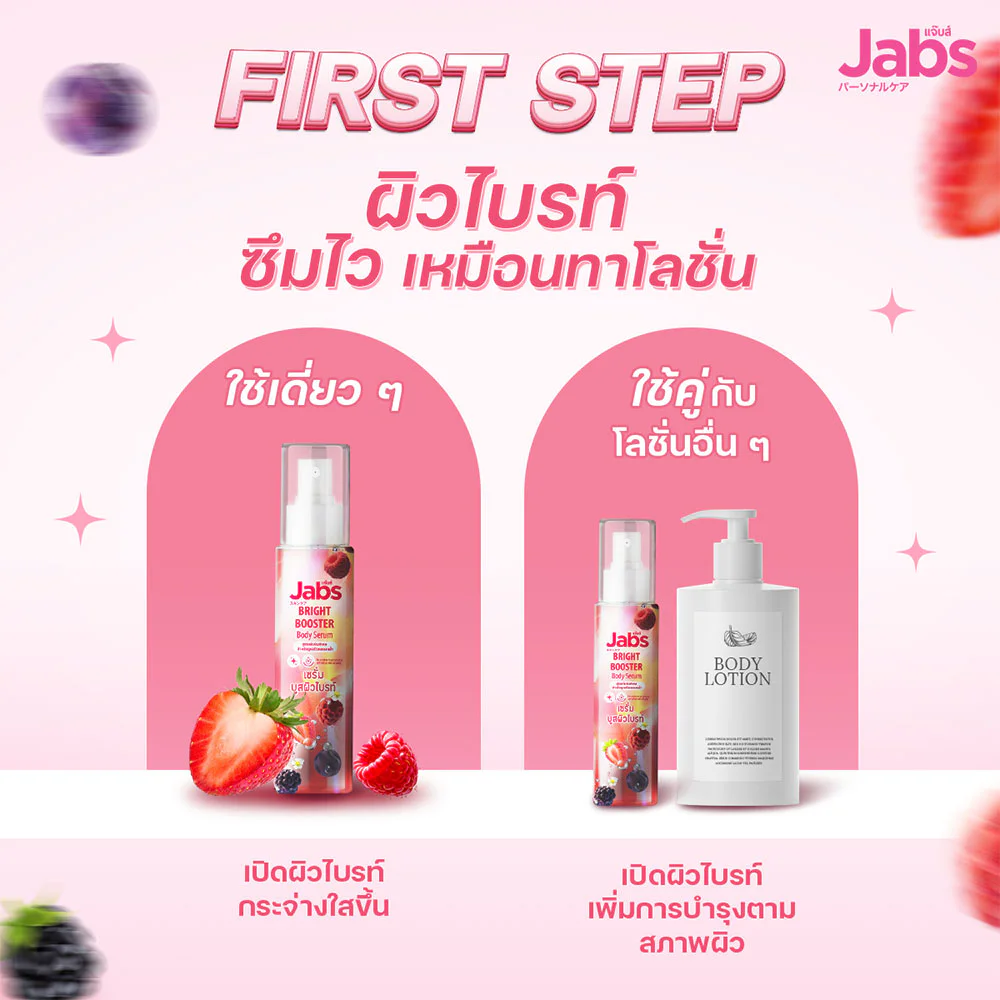 Jabs Bright Booster Body Serum 150ml Special concentrated body serum for treating dull skin problems with a combination of natural extracts from Acai Berry Extract combined with Polyplant Red Fruits, which is a combination of 3 fruits: Raspberry, Strawberry and Blackberry, supplemented with high-performance whitening agents from Niacinamide, Arbutin, Fermented Honey and Acetyl Glucosamine, which helps reduce dark spots, reduce dullness, exfoliate skin cells without causing irritation, and adjust skin tone to be brighter and clearer. Also combined with Sodium Hyaluronate, it helps retain moisture for the skin, making the skin look smooth and naturally healthy.