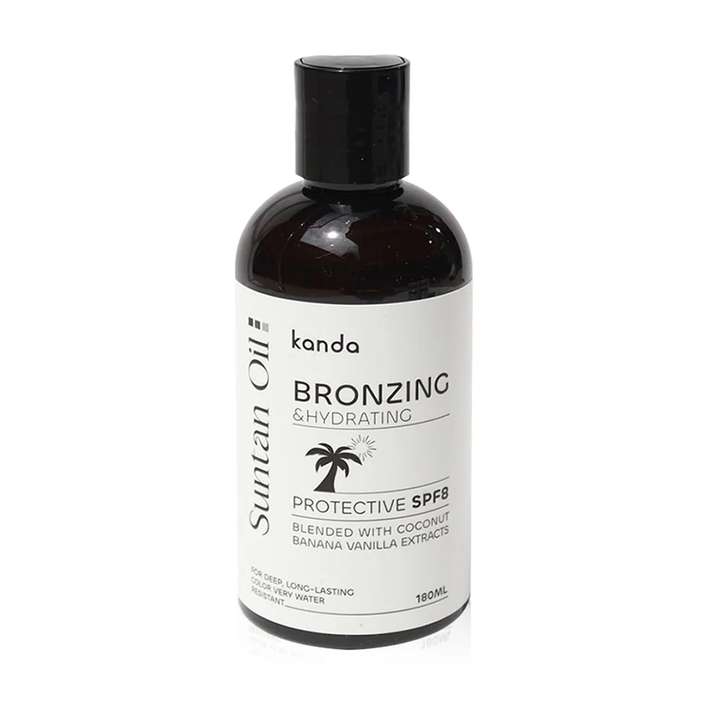 Kanda Suntan Oil Protective SPF8 180ml Gentle skin nourishing tanning oil Provides deep hydration Even dry, flaky skin is not sticky. Covers the skin evenly, giving the skin a healthy tan. With a mixture of natural oils obtained from coconut, sunflower and cocoa beans. With the relaxing scent of banana and vanilla. Feel the atmosphere of the Mediterranean Sea. and protect the skin from sunlight