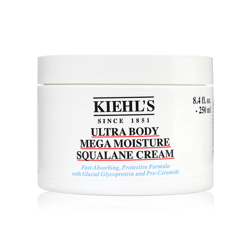 Kiehls Ultra Body Mega Moisture Squalane Cream 250ml A rich body cream for dry, sensitive and easily irritated skin. Formulated with squalane and pro-ceramides that deeply moisturize and strengthen the skin's barrier, it helps lock in moisture for a long time. The cream is lightweight, absorbs quickly and leaves the skin feeling comfortable all day long.