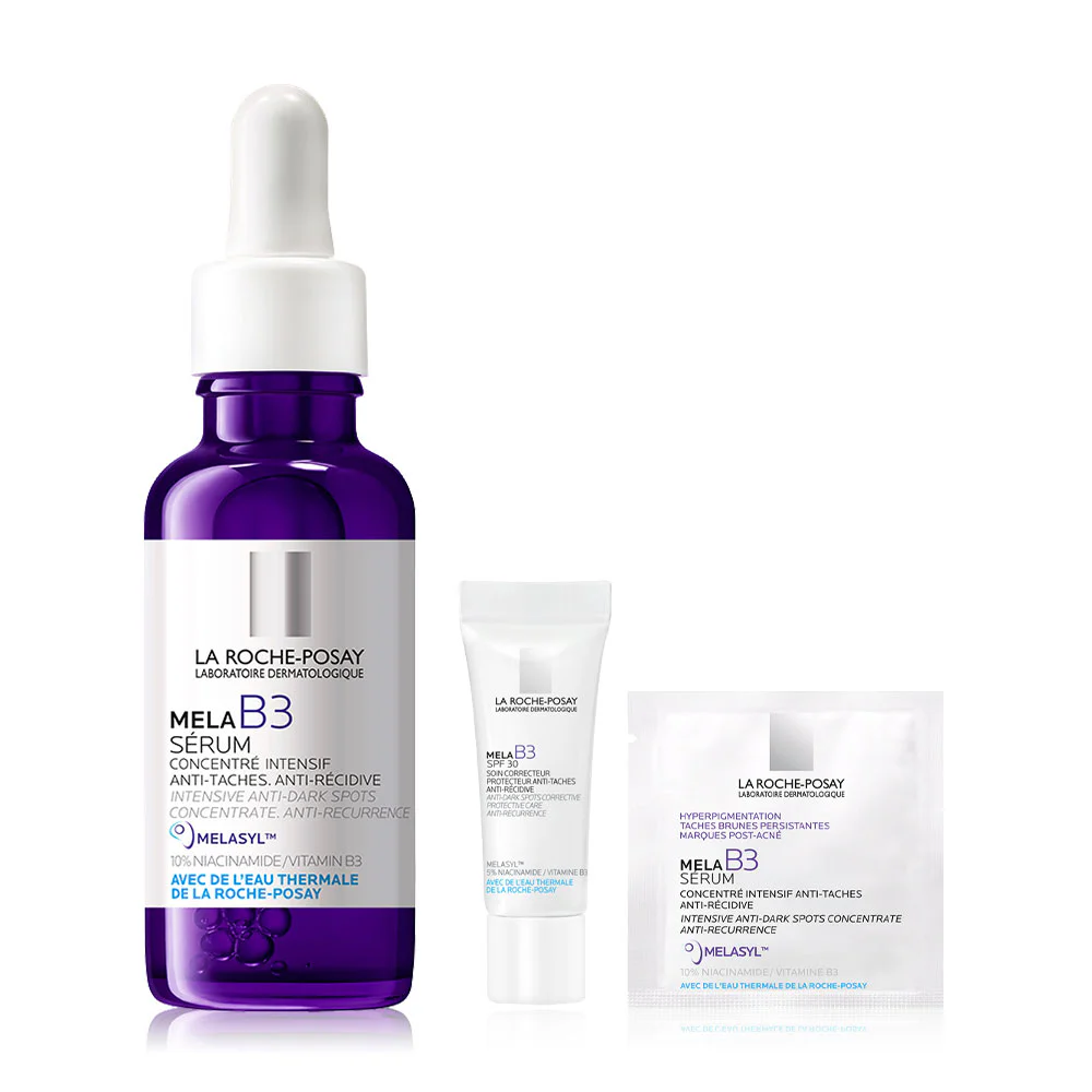 Free! La Roche Posay Mela B3 Serum 2ml and La Roche Posay Mela B3 Cream 3ml A gentle moisturizer (Hypoallergenic) that protects skin from the sun with SPF30 and reduces the appearance of dark spots and deep-seated freckles. Combined with 5% Niacinamide to reveal brighter skin.