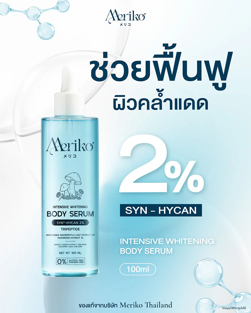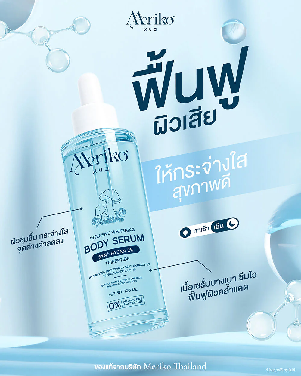 Meriko Intensive Whitening Body Serum 100g This intensive, lightweight, and fast-absorbing body serum combines over 10 premium imported extracts to deeply nourish, gently exfoliate, reduce dark spots, soothe, and moisturize the skin, leaving it smooth, radiant, and healthy-looking.