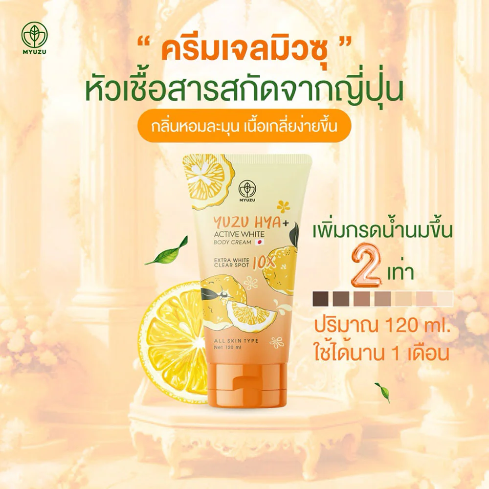 Myuzu Yuzu Hya Active White Body Cream 120ml This body cream gel is easy to spread, absorbs quickly, and isn't sticky. It combines concentrated extracts from Yuzu Extract B, Centella Extract, Ginseng Extract, G2 White, Glutathione, and Collagen to gently exfoliate skin cells, giving it an even, brighter complexion. It also includes Lactic Acid, Niacinamide, Vitamin B3, and Vitamin E to help restore dry, rough skin to moisture, reduce dark spots, and scars, revealing smooth, beautiful skin that looks radiant and has an aura.