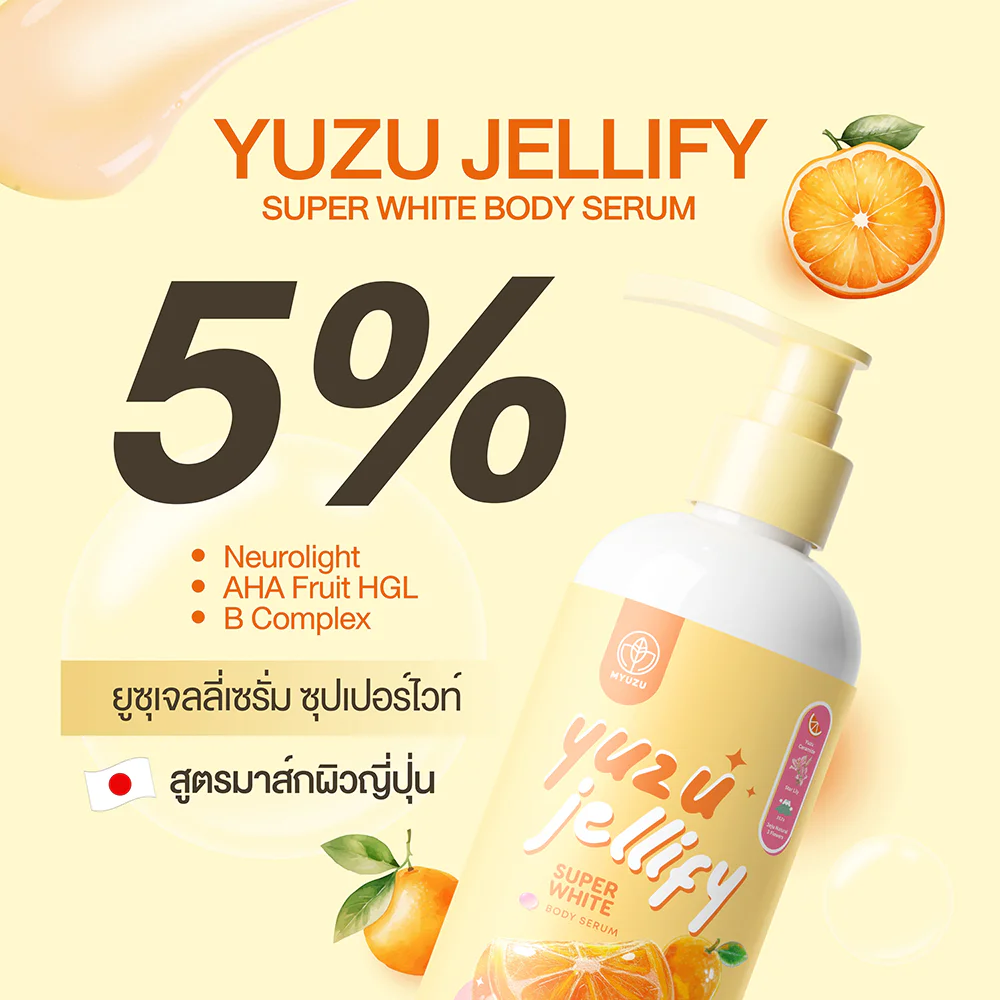 Myuzu Yuzu Jellify Super White Body Serum 200ml Body serum, Japanese skin mask formula, light texture, combined with 5% Neulolight and AHA Fruit HGL, helps gently exfoliate skin cells, reduces dark spots, along with B Complex, helps restore skin moisture, adjusts skin tone to be even, looks brighter, reveals smooth, beautiful skin, looks radiant, has an aura.