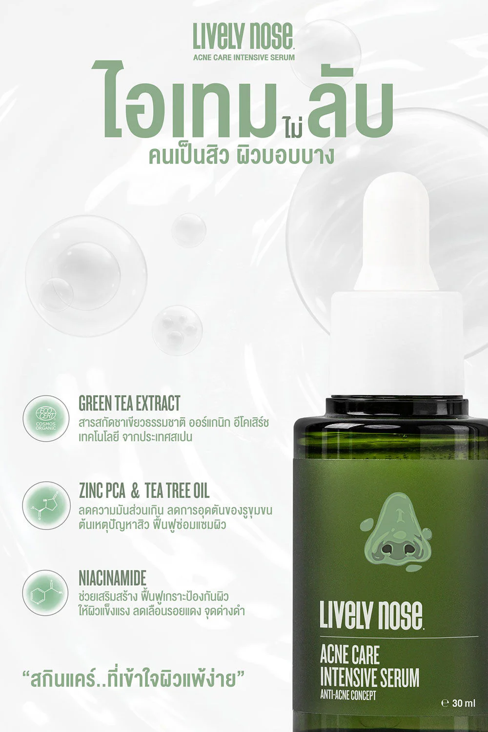 Nakiz Lively Nose Acne Care Intensive Serum 30ml Facial serum with a soft, smooth texture, light, absorbs quickly, not sticky, effectively restores acne-prone skin and soothes the skin to look healthy.