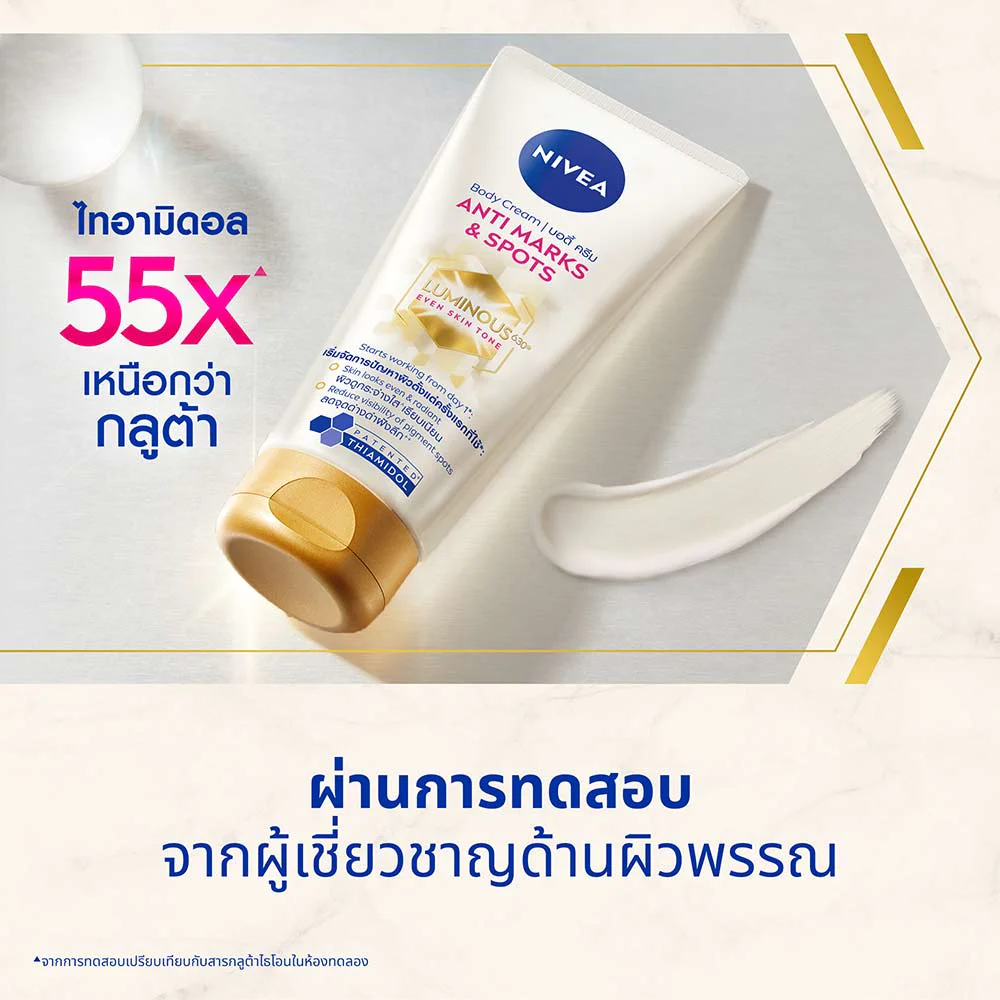 NIVEA Body Cream Anti Marks & Spots 200ml Body cream with innovative skin care. Powerful formula combined with Nivea's exclusive thiamidol. Helps adjust uneven skin tone, reduce stretch marks, freckles and dark spots to fade. Provides long-lasting moisture throughout the day.