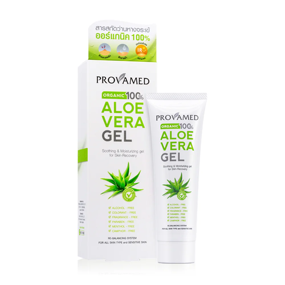 PROVAMED Aloe Vera Gel 50g Organic aloe vera gel, combined with cucumber and Centella asiatica extracts, helps restore skin, reduce irritation, fade dark spots and redness from acne, balance skin for a lively look, and protect skin while exposed to the sun, preventing skin from burning, revealing hydrated, touchable skin.