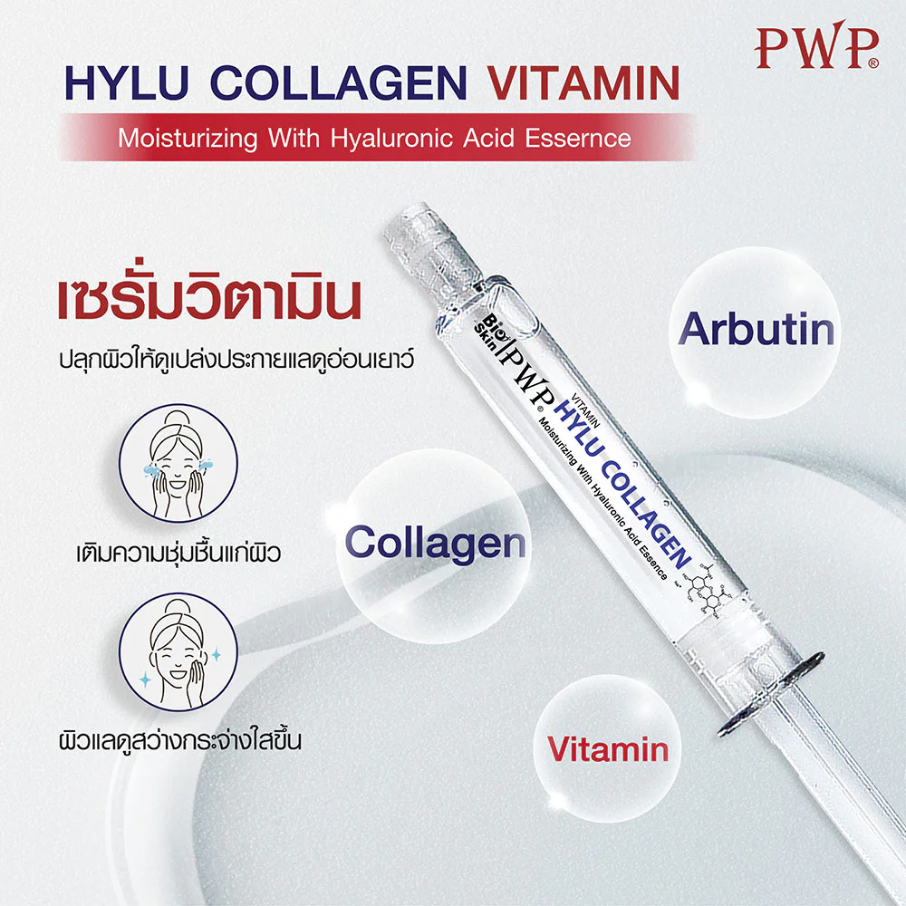 PWP Hylu Collagen Vitamin 10ml Vitamin serum for skin care, combining Hyaluronic Acid, Collagen and Vitamin to help moisturize the skin. Wrinkles and dark spots look faded. without being sticky Reveal bright, youthful, radiant-looking skin