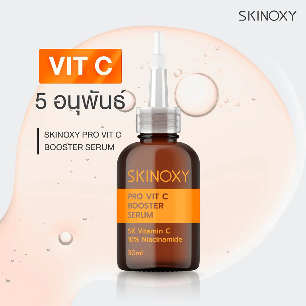 Skinoxy Pro Vit C Booster Serum 10ml Facial serum that makes the skin look bright and clear, restores dull and damaged skin, reduces dark spots, combines Niosomal Encapsulation technology that has the ability to retain important substances for maximum efficiency, works longer, and helps nourish the skin deeply.