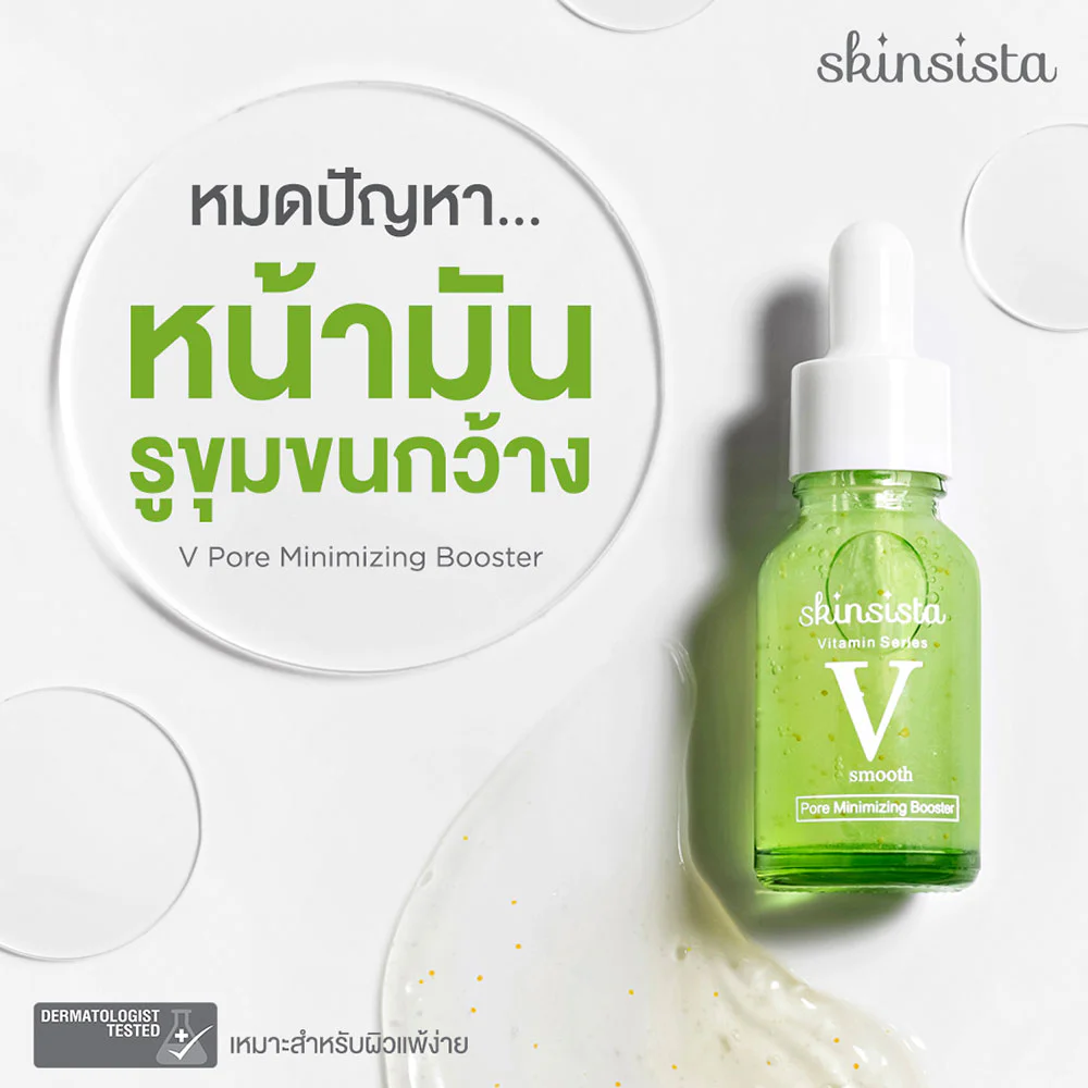 Skinsista V Pore Minimizing Booster 15ml Light texture booster Adjust the skin condition to be ready to receive full nourishment. As well as helping to stimulate various nutrients to absorb into the skin better, combining concentrated vitamin B9 and extracts from 3 colored seaweed, 4 species from Jeju Island, treating 3 main causes of wide pores and stimulating the creation of 5 types of collagen. Makes the joints between the skin layers tighter. Helps tighten pores. As well as controlling oil, reducing clogged pores, the skin is smooth like applying a primer.