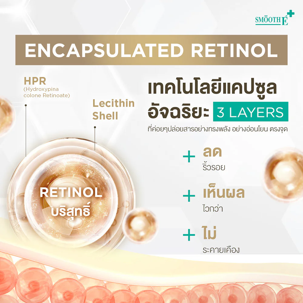 Smooth E Retinol Plus Deep Wrinkle Repair 13g Concentrated facial serum Combined with Retinoid Complex 3.9% with 3-Layer Lecithin Encapsulation technology, it helps reduce wrinkles, dark spots and restore smooth skin. With 3x Ceramide, it helps even out skin tone and strengthens the skin barrier, giving you smooth skin, tightening pores and looking healthy.