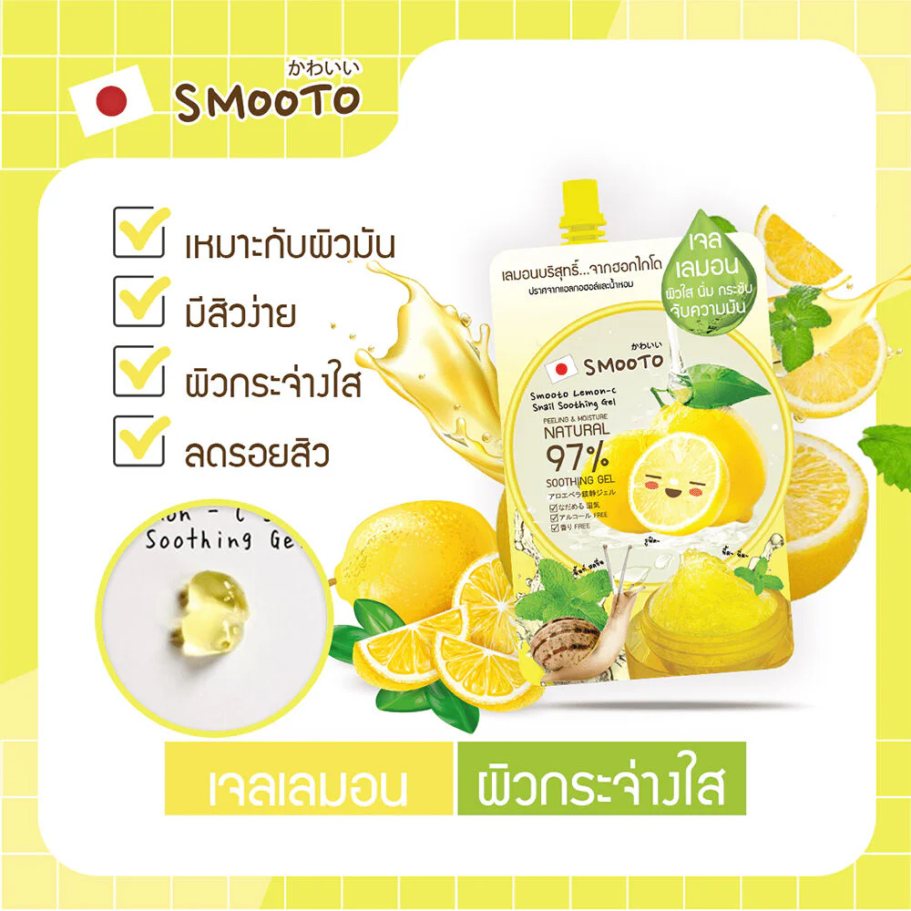 Smooto Japan Lemon-C Snail Soothing Gel 50g This skin care gel is made with pure, concentrated Hokkaido lemon, enriched with natural extracts to brighten your skin and remove excess oil. It also contains pure mint to help minimize the appearance of pores, while snail slime helps strengthen and firm your skin. It eliminates the worry of skin problems and clogged pores.