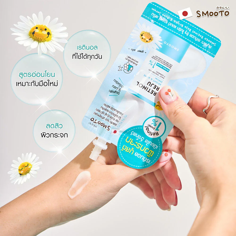 Smooto Japan Retinol Reju Bright & & Acne Serum 7g Retinol Ampoule, a gentle formula for acne-prone skin and all skin types, even sensitive skin. It restores acne-prone skin completely, treats acne problems, acne scars, dark spots, and reduces the appearance of pores, while soothing the skin and reducing premature wrinkles with Retinol Encapsulation technology, combined with daisy extract and 7 types of ceramides, boosting the skin to look naturally glowing, revealing smooth, fine, and brighter skin than ever before. It doesn't make the skin dry or tight, and is absorbed quickly and is not sticky.