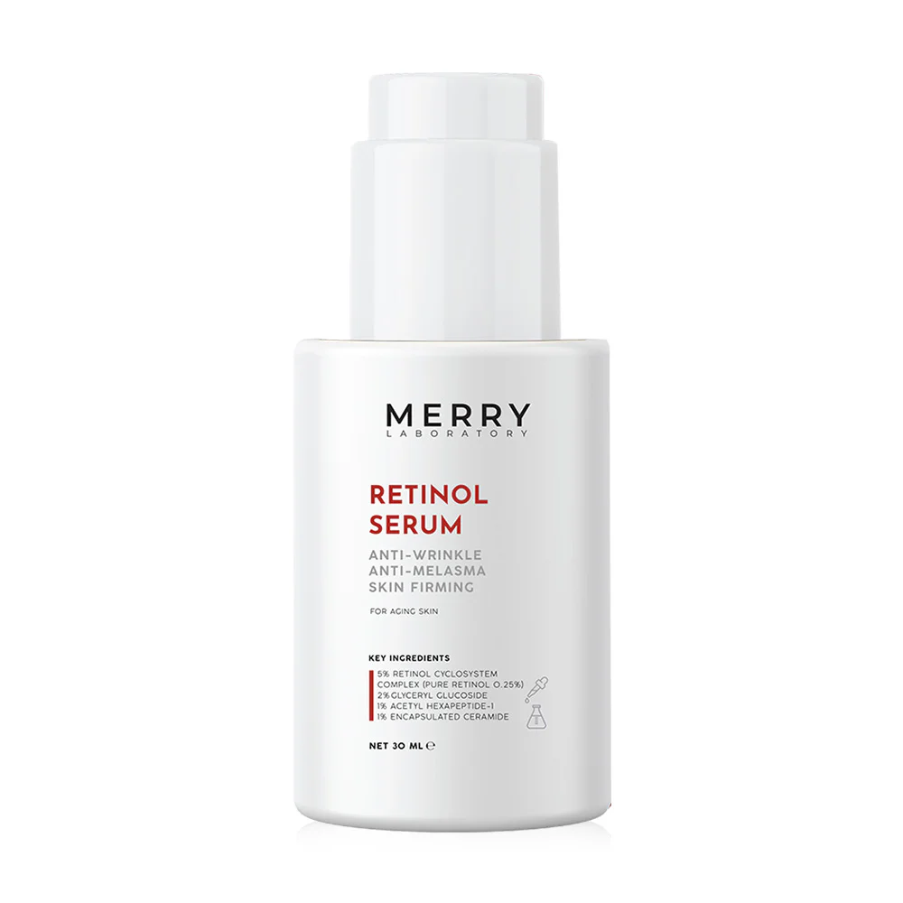 The Merry Laboratory Retinol Serum 30ml Retinol serum with a light texture, comfortable on the skin, easy to absorb, not sticky. With the value of pure vitamin A derivatives, it helps reduce wrinkles, making the skin smooth and brighter. It also combines Glyceryl Glucoside, Acetyl Hexapeptide-1, and Encapsulated Ceramide to help strengthen the skin's protective barrier, giving the skin long-lasting moisture, revealing strong, hydrated, and youthful-looking skin.