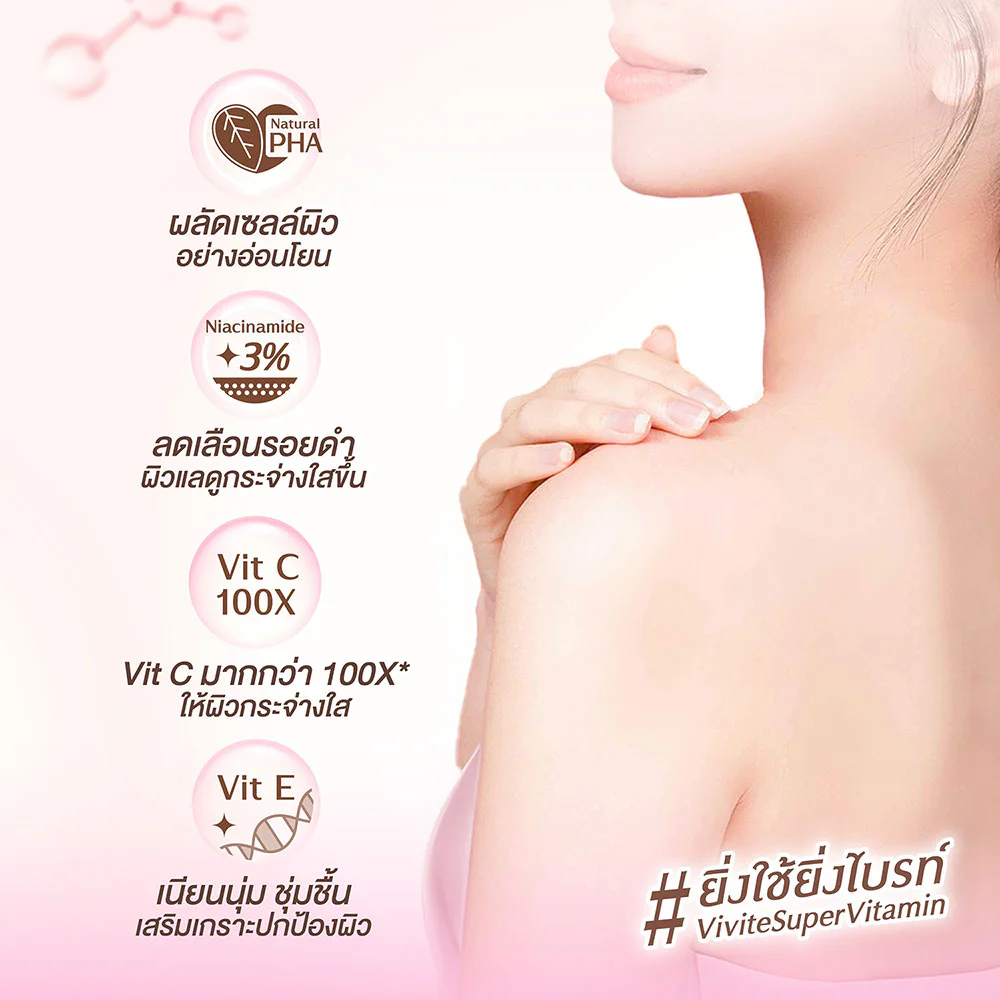 Vivite Super Vitamin Niacinamide Body Serum 170ml Body serum helps restore dull and damaged skin to be bright with natural extracts for soft, smooth, moist skin with a fragrant aroma extracted from Essential Oil. The serum is light and not sticky.