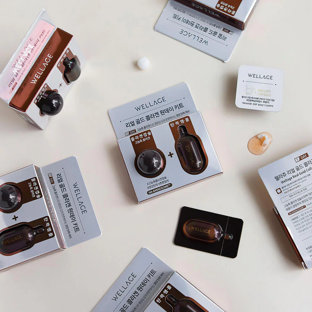 Wellage Real Gold Collage One Day Kit 15ml Facial serum capsule set consists of 24k gold, concentrated collagen from Sunflower Seed Oil and White Lupin Seeds Extract. It helps restore skin quickly, reduces wrinkles, increases elasticity, and adds moisture to the skin, giving it a smooth and firm look.
