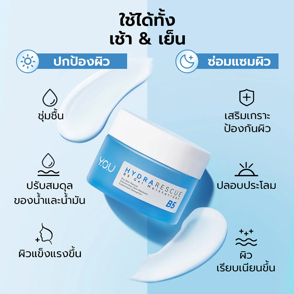 YOU Hydrarescue B5 Gel Moisturizer 50g A lightweight gel-textured moisturizing cream enriched with Provitamin B5, 9D Hyaluronic Acid and Calendula Officinalis Extract to soothe and maintain moisture for soft, smooth and moisturized skin.