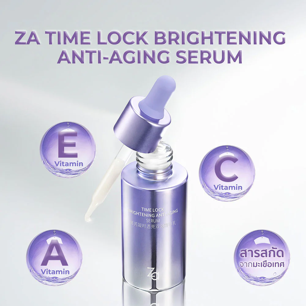 ZA Time Lock Brightening Anti-Aging Serum 30g Facial serum helps increase skin elasticity, reduce wrinkles and dark spots to fade. Combined with Vitamin A, C, E and tomato extract, it helps increase moisture and evens out skin tone, revealing hydrated, youthful and healthy skin.
