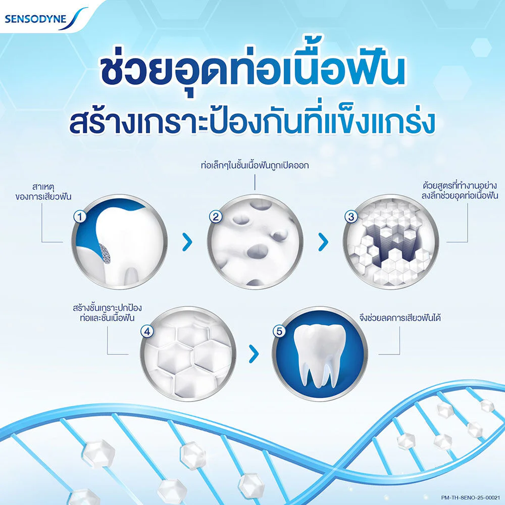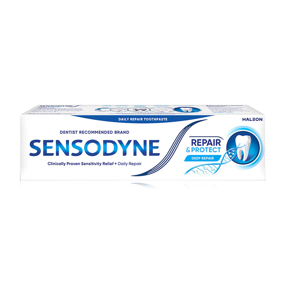 Sensodyne Toothpaste Repair & Protect 100gSensodyne's latest innovative toothpaste contains NOVAMIN, a technology that helps protect and restore sensitive areas by creating a protective layer that is similar to the natural protective layer of dentin. It effectively reduces tooth sensitivity and contains ingredients that provide extra refreshing sensations during and after brushing, leaving your mouth clean and your breath fresh.