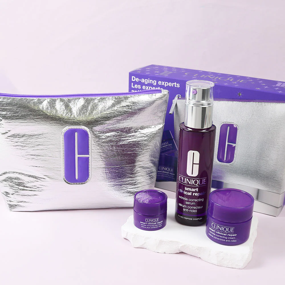 Clinique De Aging Experts Set A skincare set that helps reduce wrinkles and signs of aging for youthful, smooth skin. Includes a silver cosmetic bag.