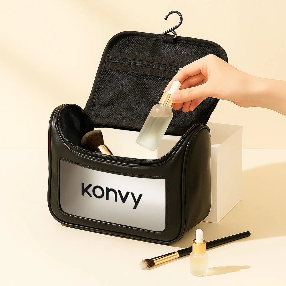 Konvy Waterproof Cosmetic Bag #Black Make every trip stand out with this black cosmetic bag. This stylish Convy design is made from high-quality materials and meticulously sewn. It can hold a lot of items and has a hanging hook for added convenience. It also comes with waterproof features, allowing you to carry your belongings with confidence.