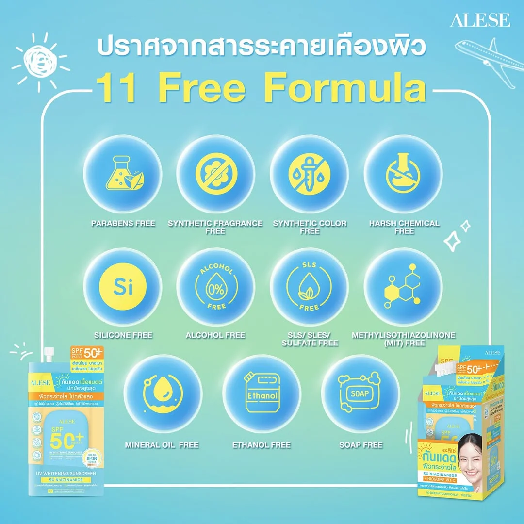 ALESE UV Whitening Sunscreen SPF50+ PA++++ 7g Sunscreen for the face, matte texture, light, easy to spread, controls oil, waterproof, sweatproof, does not clog the skin, helps protect the skin and wrinkles caused by UVA/UVB rays and dust with Tinosorb A2B innovation and combined with 5% Niacinamide helps reduce dark spots, revealing smooth, bright skin that looks radiant.