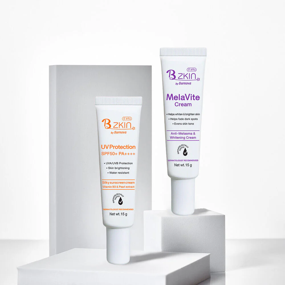 B Zkin UV Protection SPF50+ PA++++ 15g Chemical sunscreenWith SPF50+ PA+[9389955550003]++ helps protect skin from both UVA and UVB rays. Sun protection and whitening formula with vitamin B3 and pearl extract helps to keep skin healthy. Helps skin look younger and brighter.