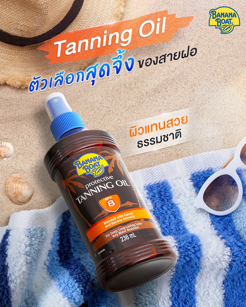 Banana Boat Protective Tanning Oil SPF8 236ml Tanning Oil SPF8 formula combines extracts from cocoa beans, carrots, bananas and coconut to nourish the skin, making it soft, moist and giving it a long-lasting tan color while protecting the skin from sunburn.