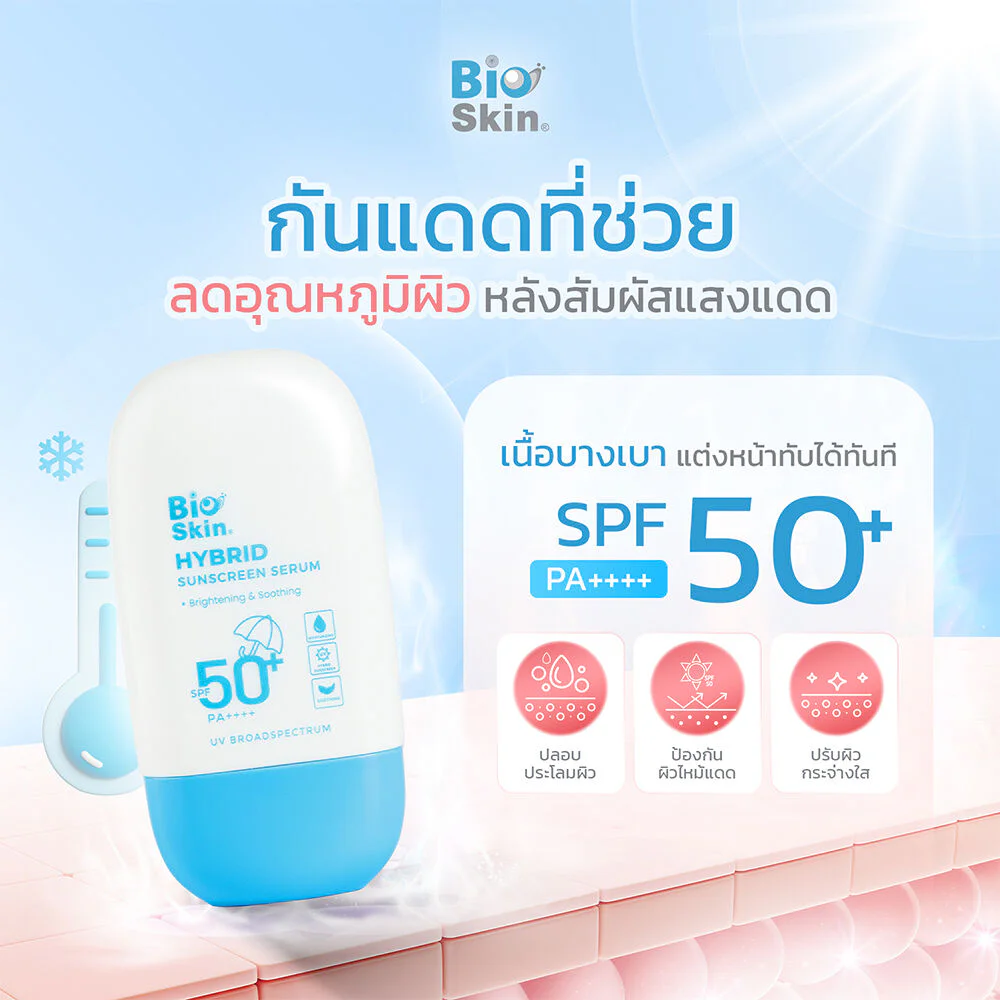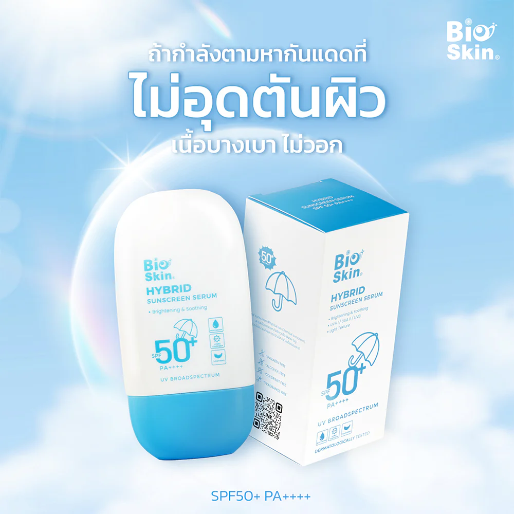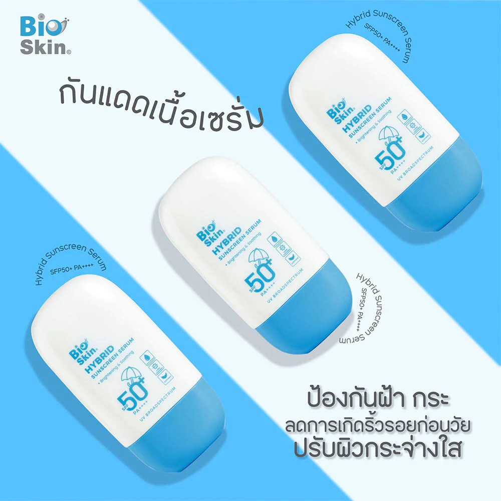 Bioskin Hybrid Sunscreen Serum SPF50+ PA++++ 50g A lightweight, non-greasy serum sunscreen that spreads easily without leaving a residue, protecting skin from UVA and UVB rays.  It also contains lotus extract to help reduce skin temperature from heat, brighten the skin, and soothe the skin, reducing irritation from chemicals and sunlight.