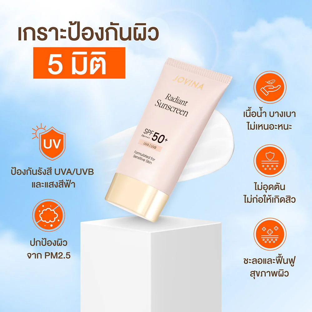 JOVINA Radiant Sunscreen SPF50+ PA++++ 30g This lightweight, water-based, and easily absorbed hybrid sunscreen is non-sticky. Encapsulated Sunscreen technology protects skin from UVA/UVB rays, Blue Light, and PM 2.5 dust pollution. Combined with Water Lily extract and Plant Based Collagen, it soothes skin irritated by sunlight and increases skin elasticity, revealing smooth, beautiful skin with all-day protection and confidence.
