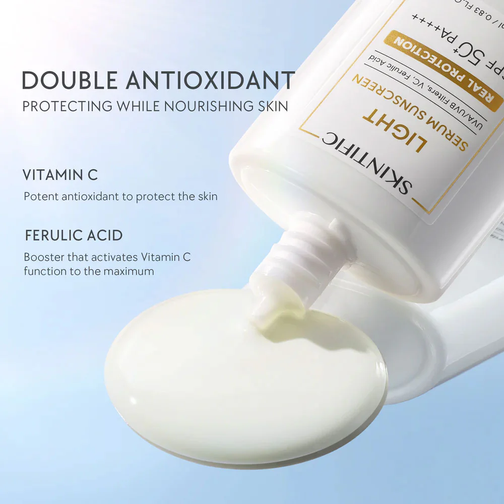 SKINTIFIC Light Serum Sunscreen SPF50 PA++++ 25ml Sunscreen cream with a comfortable formula for oily skin. Light texture, absorbs quickly, not sticky after application. Protects against UVA/UVB rays, blue light and pollution with SPF50 PA+++++. Enriched with Vitamin C and Ferulic Acid, it helps prevent signs of premature aging.