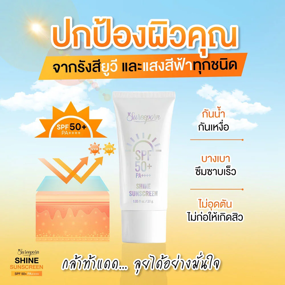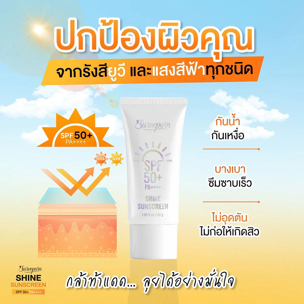 Sureeporn Shine Sunscreen SPF50+ PA++++ 30ml Hybrid Sunscreen with a light texture, easy to spread, absorbs quickly, not sticky, helps blur pores, protects skin from sunlight with SPF50 PA + + + + + Protects skin from UVA UVB rays and blue light that cause dark skin, freckles, sunburn and dark spots with extracts that nourish the skin to be strong, helps restore moisture, revealing bright, even, healthy skin.