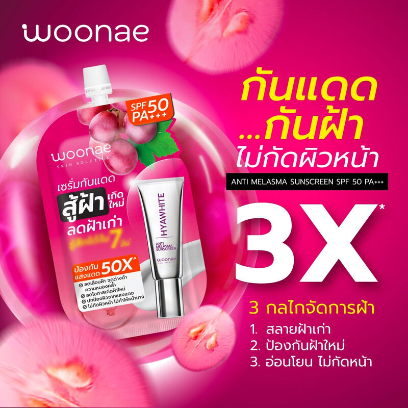 Woonae Anti Melasma Sunscreen SPF50 PA+++ 10g Innovative sunscreen serum, light texture, fast absorbing, non-greasy, helps reduce sunburn problems. Manage dark spots at the source and reduces the likelihood of a recurrence. It also protects the skin from UVA / UVB rays with SPF50 PA+++ helps reduce dullness. Ready to nourish the facial skin to be moisturized, gentle, suitable for sensitive skin, does not bite the face, does not make the face thin.