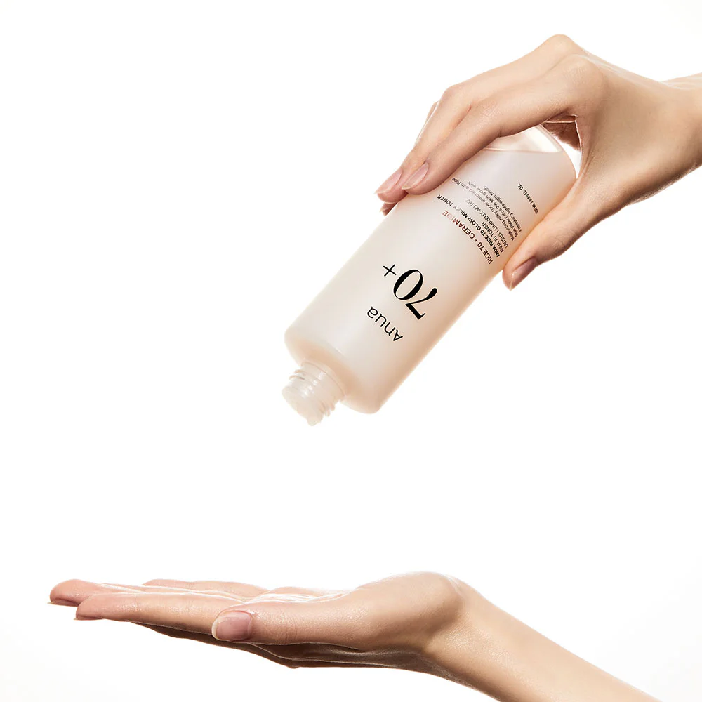 ANUA Rice 70 Glow Milky Toner 250ml This lightweight, milky toner is enriched with Rice Bran Water to hydrate, even out skin tone, control excess oil, and strengthen the skin's protective barrier for smooth, radiant skin.