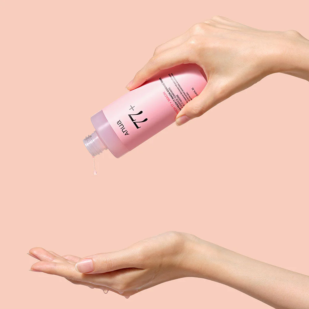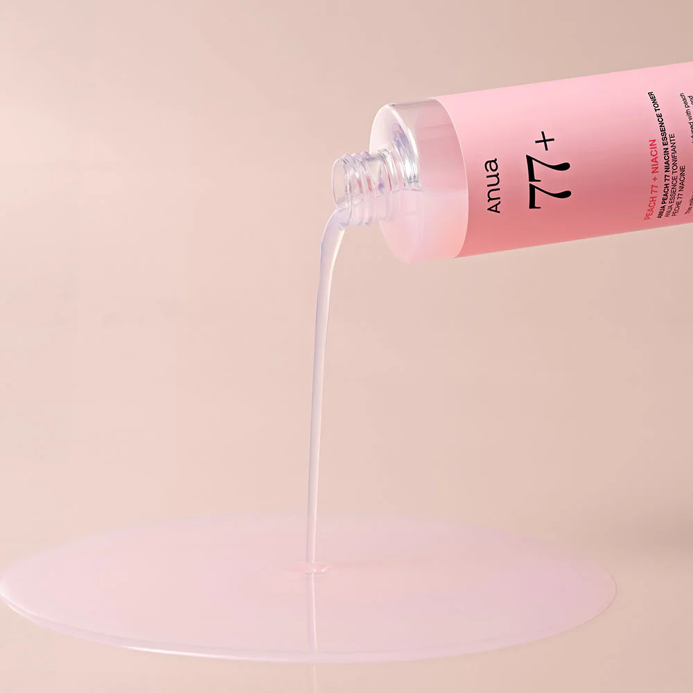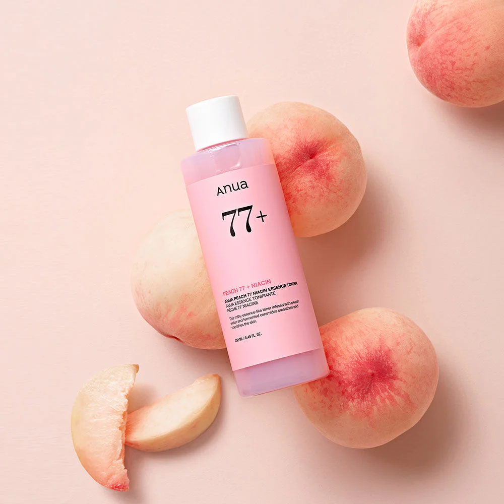 ANUA Peach 77 Niacin Essence Toner 250ml A lightweight, watery toner enriched with 77% peach extract and ceramide to hydrate, smooth, and deeply nourish the skin, preparing it for makeup application for a flawless, long-lasting finish.