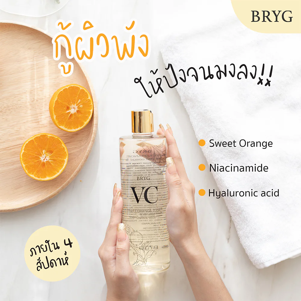 BRYG VC Sweet Orange Toner 500ml Toner that cleanses and nourishes the skin with vitamin C from oranges. Provides moisture mixed with natural extracts. Helps strengthen the skin, prevents dullness, makes the skin feel refreshed and helps balance the skin. Protects the skin from pollution, making the skin bright and clear.