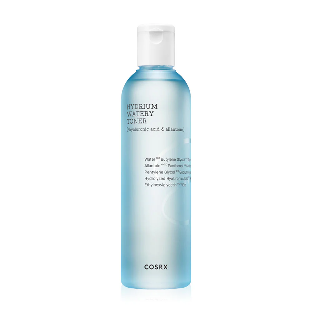 COSRX Hydrium Watery Toner 150ml A lightweight, non-sticky toner that helps replenish and retain moisture for the skin with 6 types of hyaluronic acid for hydrated skin all day long. It also helps soothe sensitive skin with Allantoin D-Panthenol, maintaining the balance of oil and water.