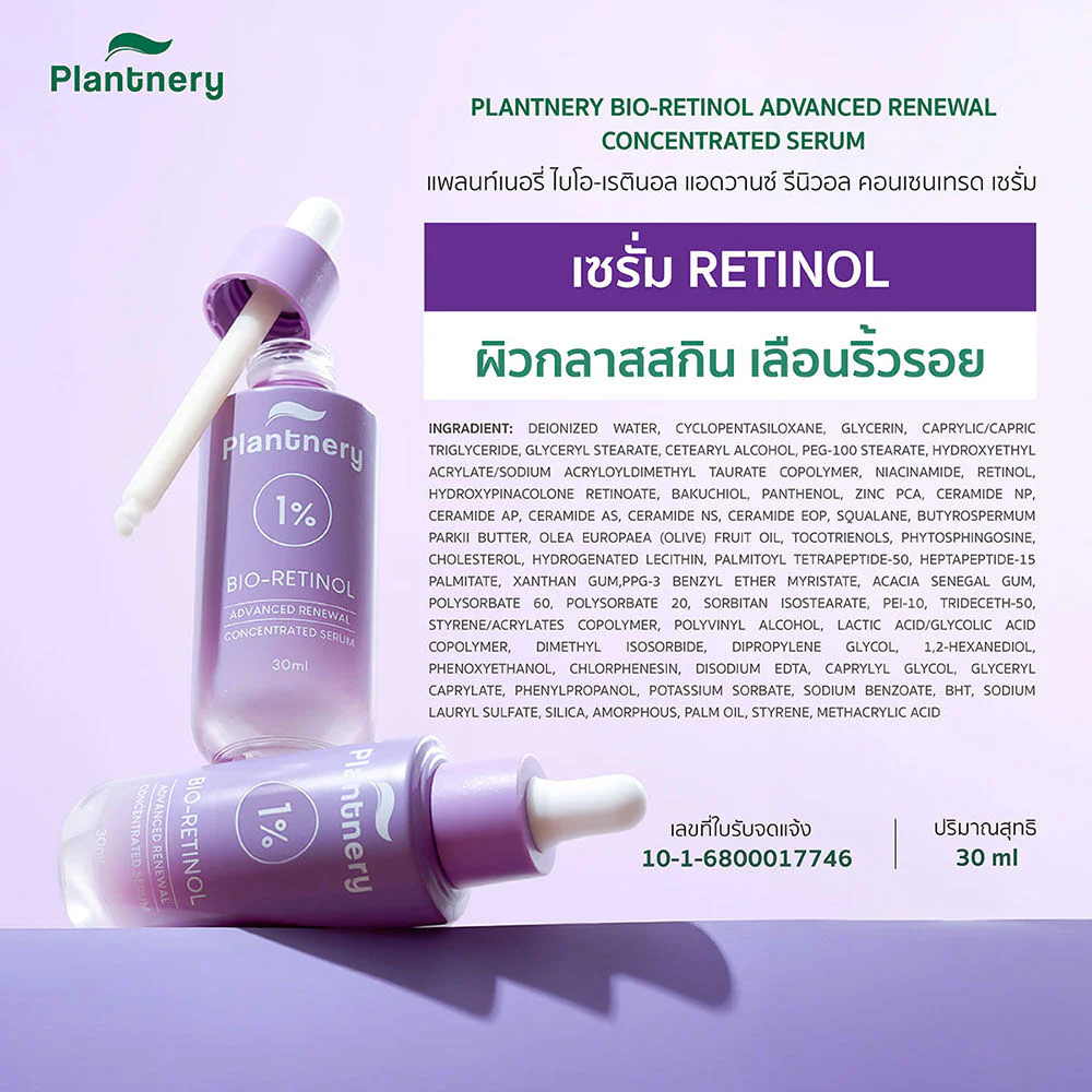 Plantnery Bio-Retinol Advanced Renewal Concentrated Serum 30ml Concentrated retinol serum with ingredients 1% Retinol HPR Complex and Bakuchiol help deeply nourish the skin, reduce wrinkles, dark spots and dullness, combined with Niacinamide and Zinc PCA to help even out skin tone, tighten pores and control excess oil, along with 5X Ceramide, Squalane and Super Vitamin E to soothe, moisturize and protect the skin from the damage of pollution, revealing smooth, even skin that looks radiant like Glass Skin.
