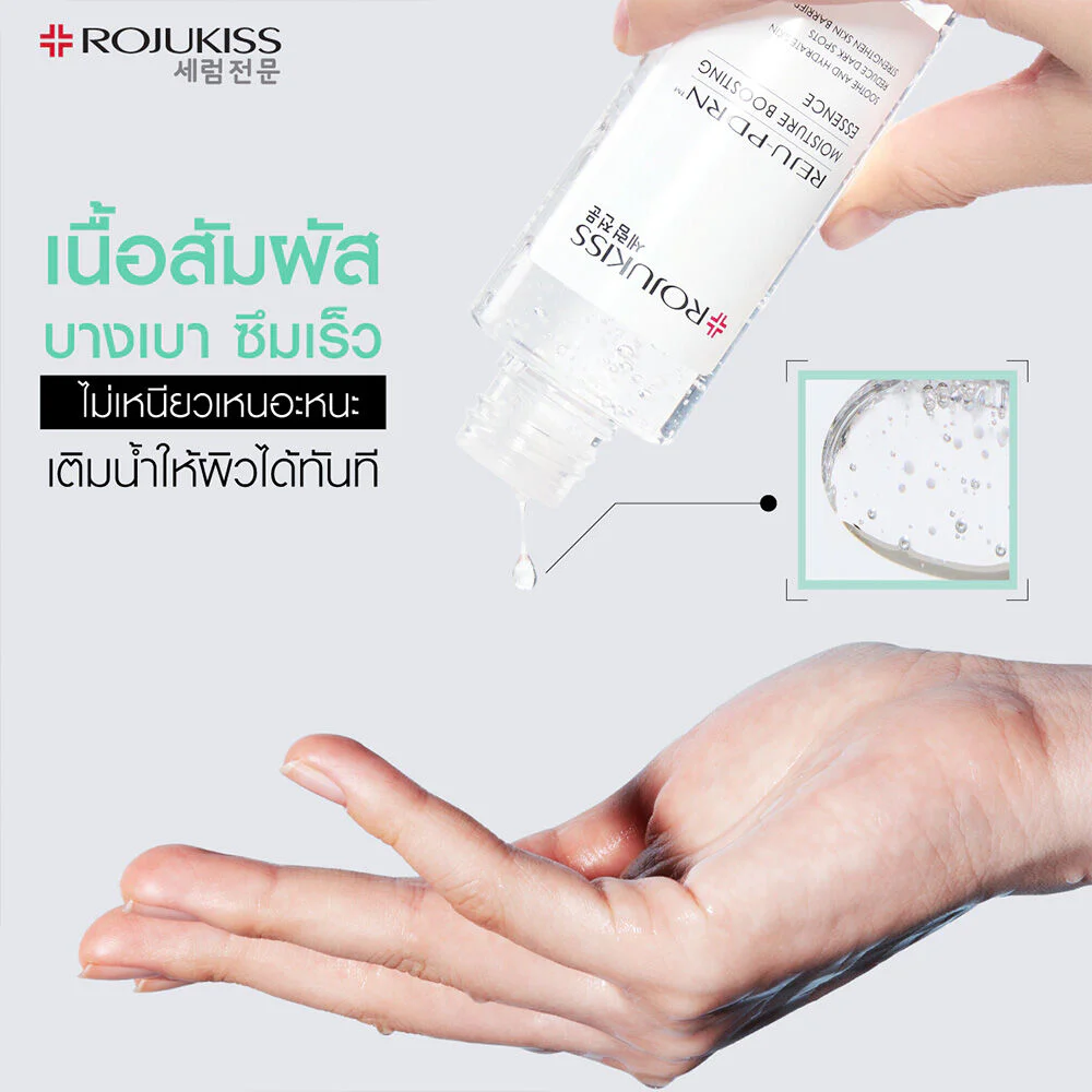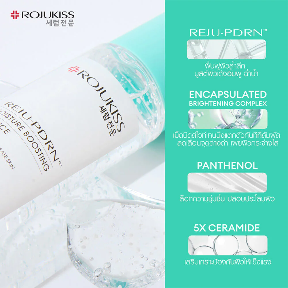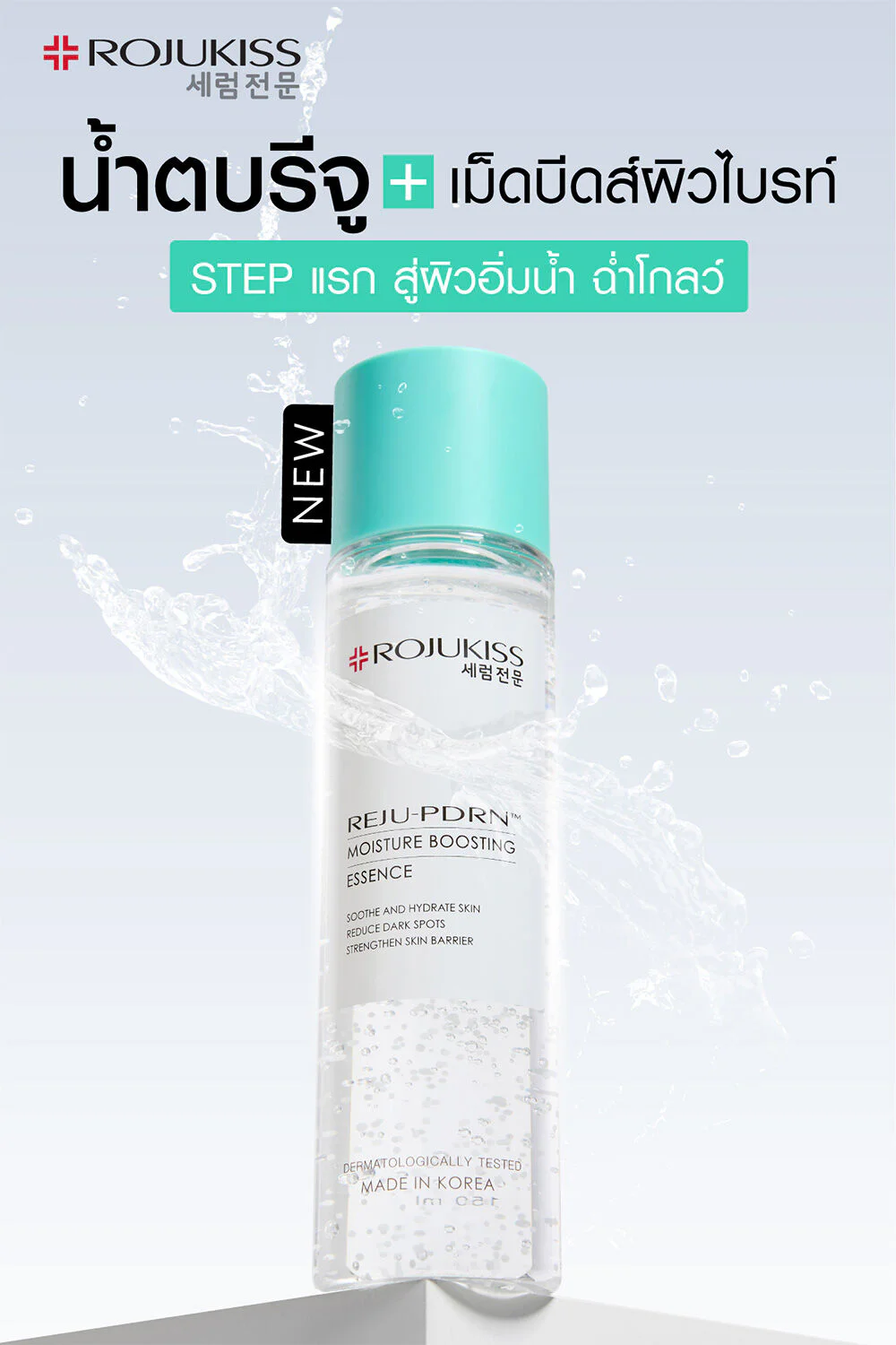 Rojukiss Reju-PDRN Moisture Boosting Essence 150ml Step Experience a radiant, glass-like complexion with Reju-PDRN Essence Water. Boosts skin's moisture, soothes, strengthens the skin's protective barrier, and restores it to be healthy and strong. With whitening beads, skin appears radiant and clear, and dark spots appear to fade.