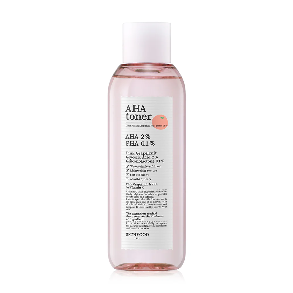 Skinfood Pink Grapefruit AHA Toner 200ml Grapefruit Toner, AHA 2 formula % has a watery texture, is quickly absorbed, and is not sticky. It combines Niacinamide, Ceramide NP, and Bakuchiol to gently exfoliate, smoothen skin, and help control excess oil, revealing smooth, healthy-looking skin.